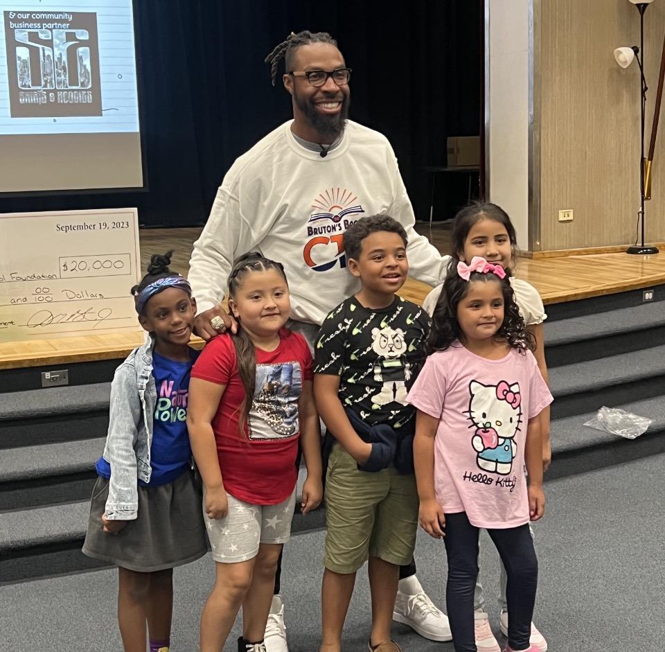 We had to bring in extra chairs to listen to our latest noon speaker. It was the former Notre Dame and Bronco standout David Bruton (pictured above with young bookworms) who established Bruton’s Books, a charitable organization committed to improving literacy among children living in low-income communities in the greater Denver area.